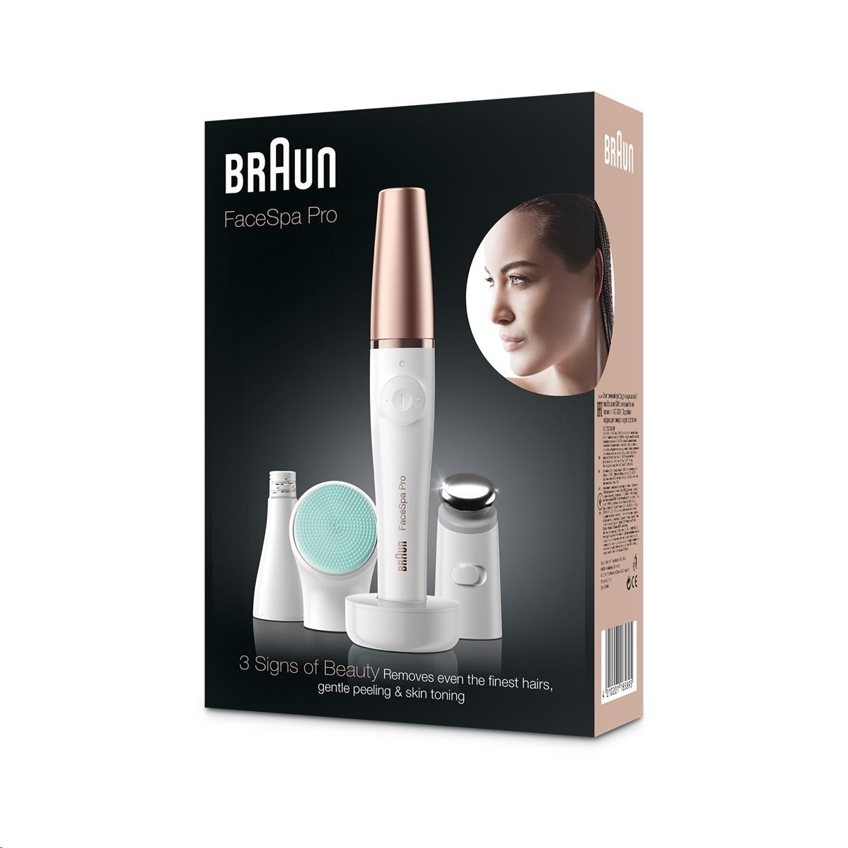 Braun FaceSpa Pro je první zařízení na světě 3v1 pro epilaci obličeje, čištění a tónování pleti. Nástavec epilátoru odstraňuje jemně chloupky na obličeji s kořínky pro dlouhotrvající efekt hladké pokožky. Jemný kartáček pro čištění obličeje šetrně odstraňuje nečistoty z citlivé pokožky. Mikrovibrační hlava aplikuje sérum nebo krém pro požadované tónování pleti1. Tato prémiová edice je k dostání s elegantním pouzdrem, do kterého se vejdou všechny různé hlavy zařízení a kartáčky.