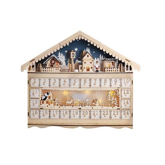 LED adventní kalendář ve tvaru horské chaty počet LED diod: 10 barva světla: teplá bílá napájení: 2x AA baterie (nejsou součástí) třída ochrany: IP20 (vnitřní použití) rozměry kalendáře: 50 x 40 x 6cm materiál: dřevo barva: hnědá
