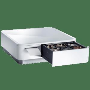 Kassenlade-Bondrucker-Kombination, Frontöffnung, Maße (BxHxT): 308x100x300mm, Einsatz: 4 Scheinfächer, 6/8 Münzfächer, 1 Scheckfach, Druck: Thermodirekt, Medienbreite (max): 58mm, Rollendurchmesser (max.): 50mm, Geschwindigkeit (max.): 100mm/Sek., Schnittstellen: 1x Slave USB, 2x Host USB (0,5A), 2x Host USB (1,5A), USB-C (for iOS), inkl.: Netzkabel (EU, UK), USB-C Kabel(weiß), Tablet-Halterung (doppelseitig), Bonrolle, Farbe: weiß