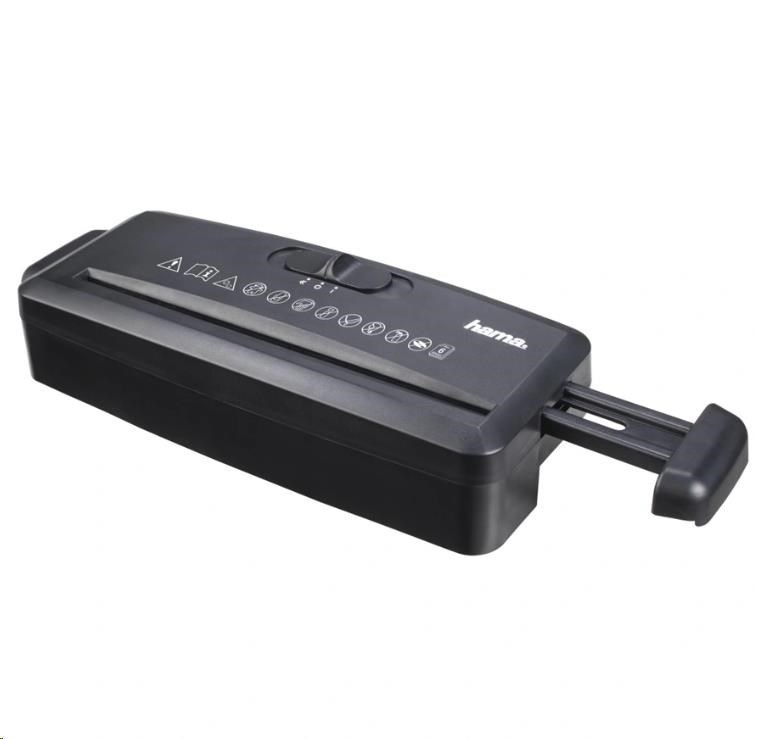 - skartovačka s přímým řezem- skartování 6 listů papíru A4 (70 g/m2 nebo 80 g/m2) najednou- skartovací hlava s vytahovacím ramenem pro upevnění na většinu kancelářských košů- vysoce kvalitní nože vyrobené z oceli si poradí i se sešívacími sponkami; sešívací sponky spojí listy papíru trvale, nejde o kancelářské sponky pro dočasné sepnutí listů papíru (viz obrázek v galerii obrázků)- automatické bezpečnostní vypnutí chránící před přehřátím a přetížením- posuvný spínač s funkcemi vypnutí, vpřed, zpětný chod (užitečné pro uvolnění zaseknutého papíru)- skartovací hlava může být nasazena na kulatý nebo hranatý koš s průměrem/šířkou cca 28-34 cmTechnické úaje:- napájení: 220 - 240 V ~- max. šířka papíru: 217 mm- max. nepřetržitý provoz: 2 minuty- max. rychlost skartace: 3 m/min.- max. výkon skartování - archy papíru (70 g/m2): 6- max. výkon skartování - archy papíru (80 g/m2): 6- velikost zeskartovaných kousků: 8 mm/proužky (přímý řez)- max. úroveň hluku: 72 dB- oddechový čas: 30 minut- úroveň ochrany: 1- bezpečnostní úroveň (dle DIN 32757): 1- bezpečnostní úroveň (dle DIN 66399)': P-1- rozměry (Š x H x V): 30,8 x 10,6 x 6,3 cm- barva: černáInformace pro spotřebitele:Norma DIN 66399:Každá osoba, ať už právnická nebo soukromá, je zodpovědná za ohleduplné a bezpečné zničení všech důvěrných, osobních a citlivých údajů. Ať už se jedná o externí nebo vaše vlastní údaje, které vyžadují speciální ochranu, doporučujeme, abyste dbali na to, aby se tyto údaje nedostaly do nesprávných rukou. Skartovačky Hama vám v tomto spolehlivě pomohou.Tato skartovačka zajistí ochranu údajů v soukromí.