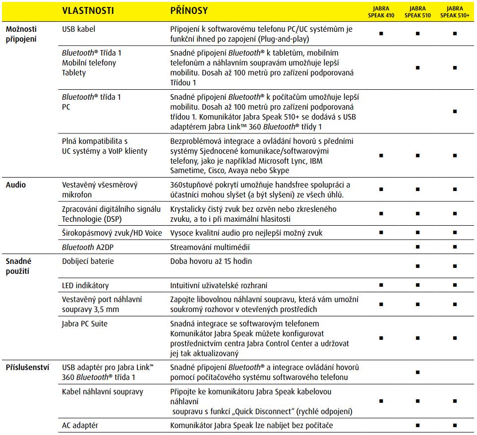 Jabra SPEAK SERIES se prodává v 6 variantách: - Jabra SPEAK 410: pouze USB připojení k PC - Jabra SPEAK 410 MS: stejné funkce jako 410, navíc optimalizováno pro MS Skype (nemusí se instalovat žádné ovladače, stačí pouze připojit) - Jabra SPEAK 510: stejné funkce jako 410, navíc obsahuje Bluetooth pro propojení k tabletu/smartphone - Jabra SPEAK 510 MS: stejné funkce jako 510, navíc optimalizováno pro MS Skype (nemusí se instalovat žádné ovladače, stačí pouze připojit) - Jabra SPEAK 510+: stejné funkce jako 510, navíc umožňuje propojit PC přes Bluetooth, součástí balení je BT USB adaptér - Jabra SPEAK 510+ MS: stejné funkce jako 510+, navíc optimalizováno pro MS Skype (nemusí se instalovat žádné ovladače, stačí pouze připojit)
