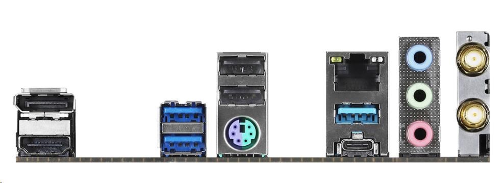Vstupy/výstupy na zadnom paneli | - 2 x porty antény - 1 x port myši/klávesnice PS/2 - 1 x port HDMI - 1 x port DisplayPort 1.4 - 2 x USB 2.0 Porty (podporuje ochranu proti ESD) - 3 x USB 3.2 porty typu A Gen1 (podporuje ochranu proti prepätiu) - 1 x USB 3.2 porty typu C Gen1 (podporuje ochranu proti ESD) - 1 x port RJ-45 LAN s LED diódou (ACT/LINK LED a SPEED LED) - HD audio konektory: Line in / predný reproduktor / mikrofón |