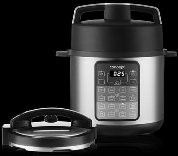 Multifunkční využití Multifunkční hrnec Concept CK7000 je vybaven dvěma poklicemi, díky kterým poskytuje opravdu široké využití. Zastane práci tlakového hrnce, horkovzdušné fritézy, rýžovaru, pomalého hrnce i jogurtovače. Snadno a rychle připravíte téměř cokoliv, na co si vzpomenete – polévku, hlavní chod i sladký dezert. Tlakový hrnec Vaření s tlakovou poklicí nabízí 8 přednastavených programů včetně pomalého vaření, sous vide nebo funkce pro přípravu jogurtu. Vaření pod tlakem je velice rychlé, takže vám ušetří spousty času i energie. Hovězí guláš nebo poctivý vývar zvládnete v tomto hrnci uvařit do 35 minut. Potraviny si navíc zachovávají svoji přirozenou chuť a aroma a díky kratší době vaření i důležité živiny. Maso vařené v tlakovém hrnci je křehčí a šťavnatější a zelenina si více zachová svou přirozenou barvu. Horkovzdušná fritéza Hrnec je vybaven fritovacím košem na vkládání potravin a horkovzdušnou poklicí, se kterou můžete využít 8 přednastavených programů vč. funkce sušení. Horkovzdušné vaření nabízí zdravou alternativu přípravy vašich oblíbených smažených pochoutek. Díky cirkulárnímu proudění horkého vzduchu získáte bez použití oleje chutné a křupavé pokrmy, které budou rovnoměrně propečené a zároveň budou obsahovat méně kalorií, cholesterolu a tuku. Vyhnete se také nepříjemnému zápachu, který doprovází klasické smažení na oleji. Přehledný displej Multifunkční hrnec Concept CK7000 je vybaven přehledným LED displejem s dotykovým ovládáním a 16 přednastavenými programy (8 pro vaření s tlakovou poklicí, 8 pro vaření s horkovzdušnou poklicí). Je vybaven časovačem a možností regulace teploty v rozmezí 80-200 °C. Během vaření s nasazenou tlakovou poklicí můžete využít funkce odloženého začátku vaření. Po ukončení zvoleného programu se hrnec automaticky přepne do režimu Keep Warm, ve kterém bude udržovat jídlo teplé. Bezpečný provoz Hrnec je vybaven pojistkou proti přehřátí a chladnou rukojetí pro bezpečnou manipulaci. Tlaková poklice je opatřena zámkem, který se automaticky aktivuje během vaření. Díky tomu je zamezeno nechtěnému otevření natlakovaného hrnce, které by způsobilo rychlý únik páry a mohlo vést k opaření. Protiskluzové nožičky zajistí perfektní stabilitu hrnce během vaření. Snadná údržba Vnější povrch hrnce stačí po vychladnutí otřít vlhkým hadříkem. Vyjímatelná vnitřní nádoba i fritovací koš jsou opatřeny nepřilnavým povrchem, takže se na ně vařené jídlo nepřichytává. Můžete je omýt v jarové vodě nebo vložit do myčky nádobí. Technické parametry: Multifunkční kuchyňský pomocník Horkovzdušná technologie (úspornější než klasické smažení na pánvi) Objem nádoby: 6 l Přehledný LED displej s dotykovým ovládáním 16 přednastavených programů včetně funkce pomalého vaření: 8 pro vaření pomocí horkovzduchu (kuře, stejk, ryba, dezert, křídla, hranolky, sušení, manuál) + 8 pro vaření v tlakovém hrnci (rýže, luštěniny, polévka, masová směs, pomalé vaření, jogurt, sous vide, kaše) Nastavitelná regulace teploty: 80-200 °C Časovač Fritovací koš je opatřen nepřilnavým povrchem a lze mýt v myčce Bezpečnostní pojistka proti přehřátí Protiskluzové nožičky Chladná rukojeť Napětí: 220-240 V Příkon: 1 500 W Tlak: 0-70 kPa Příslušenství: Lžíce na rýži Odměrka