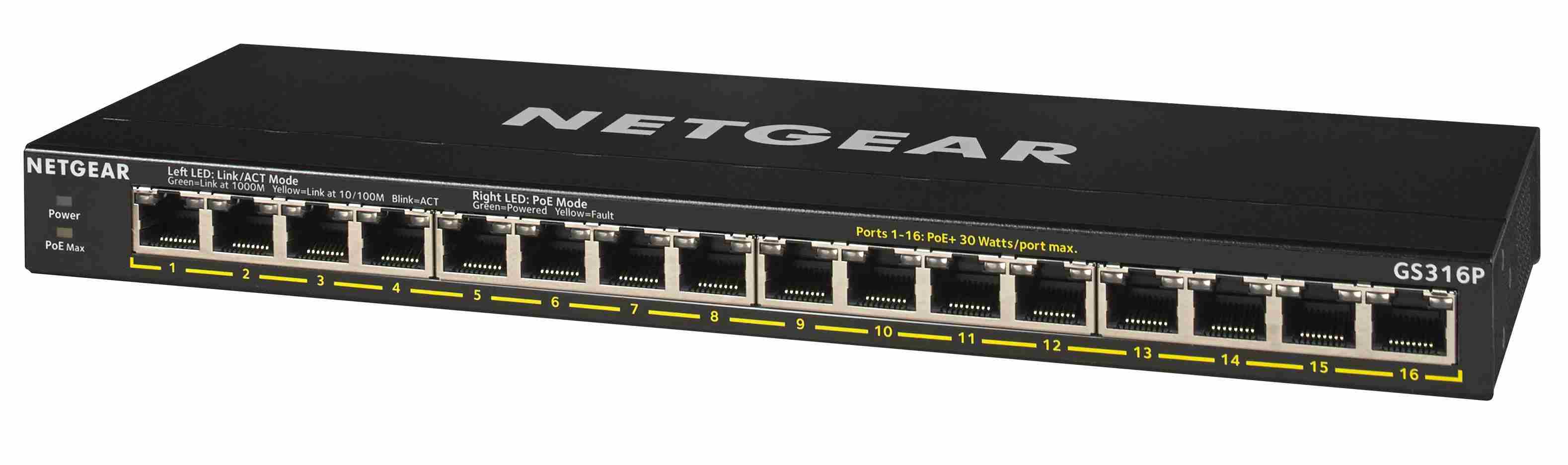 NETGEAR 16-portový gigabitový ethernetový nemanažovaný PoE+ switch (GS316P) Rýchlosť : Gigabit Počet portov : 16 PoE porty/max. výstupný výkon : 115 W Podpora energeticky úsporného ethernetu : Áno Podpora Jumbo rámcov : 9 216 bajtov Veľkosť MAC tabuľky : 4K Veľkosť paketovej vyrovnávacej pamäte : 1 MB Automatické vyváženie PoE : Áno Rozpočet PoE : Do 115 W.