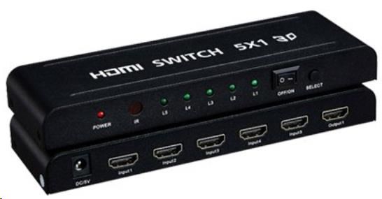 HDMI switch 5:1 s dálkovým ovladačem5 HDMI zařízení sdílí 1 HDMI výstupní zařízení (obrazovku). Výběr zařízení tlačítkem nebo dálkovým ovládáním.Podpora 20m HDMI kabelu na vstupu,10m HDMI kabelu na výstupu HDMI switche- HDMI rolišení 480i, 480p, 720i, 720p,1080i a 1080p- Podpora modů VGA,SVGA,XGA,UXGA mode- Podporuje datový tok 2.5Gbps a frekvenci až 250MHz- Podporuje standard HDMI1.4A- Nejvyšší rozlišení FULL HD 1080p/60Hz- 8bit,10bit,a 12bit barevná hloubka na kanál- Výběr vstupu tlačítkem/dálkovým ovládáním- Plug-and-play, není třeba software.- HDCP kompatibilní- V sadě dálkové ovládání pro komfortní obsluhu- Podpora 3D obrazu- Podpora FULL HD- Přídavný adaptér 230V/5V, 1A v sadě- Rozměry: 178 x 59 x 20 mm