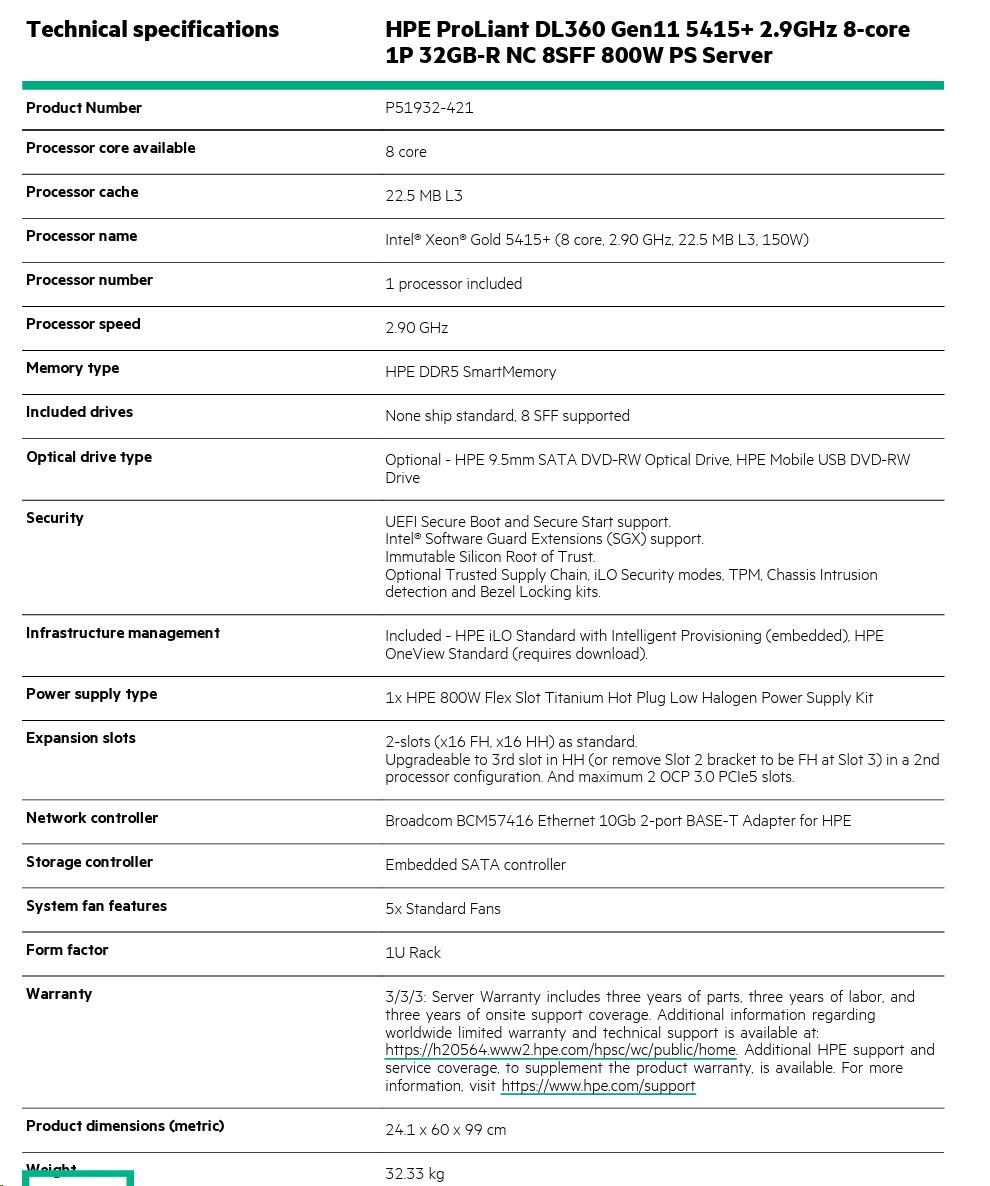 HPE PL DL360g11 5415+ (2.9G/8C/23M) 1x32G VROC (sata) 8SFF 1x800W 2x10Gb-T NBD333 1U P51932-421 RENEW