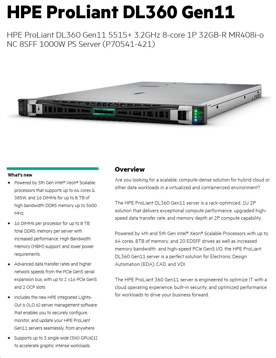 HPE PL DL360g11 5515+ (3.2/8C/165W) 1x32G (p64706) MR408i-o/4G 8-10SFF 1x1000W 2x10G-T NBD333 1U P70541-421 RENEW