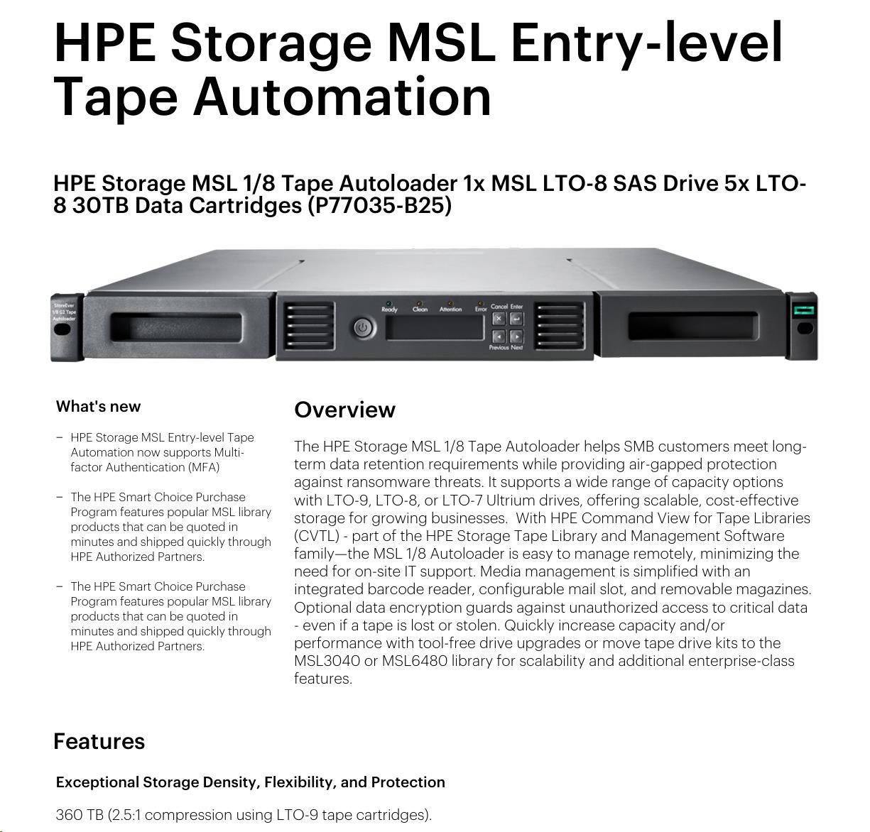 HPE Storage MSL 1/8 Tape Autoloader 1x MSL LTO-8 SAS Drive 5x LTO-8 30TB Data Cartridges