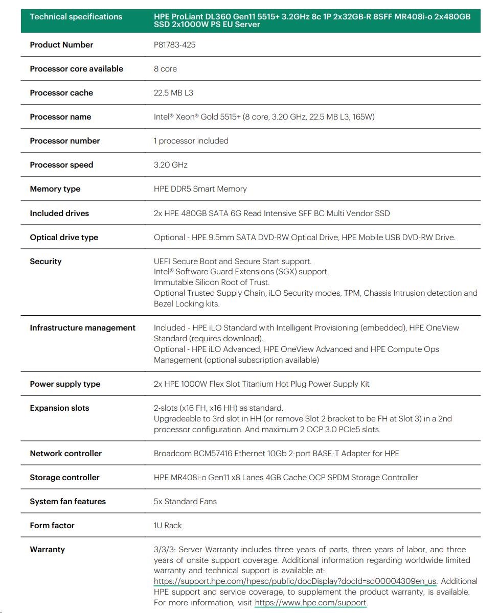 HPE PL DL360g11 5515+ (3.2G/8C) 2x32G (P64706) 8SFF MR408i-o/4G 2x480G 2x1000W 2x10G-T