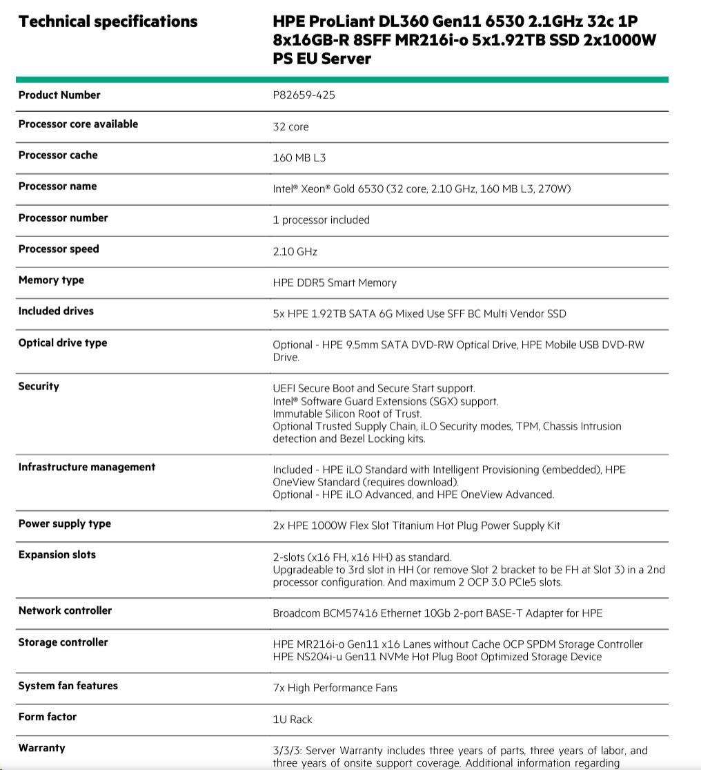 Product Number P82659-425 Processor core available 32 core Processor cache 160 MB L3 Processor name Intel Xeon Gold 6530 (32 core, 2.10 GHz, 160 MB L3, 270W) Processor number 1 processor included Processor speed 2.10 GHz Memory type HPE DDR5 Smart Memory Included drives 5x HPE 1.92TB SATA 6G Mixed Use SFF BC Multi Vendor SSD Optical drive type Optional - HPE 9.5mm SATA DVD-RW Optical Drive, HPE Mobile USB DVD-RW Drive. Security UEFI Secure Boot and Secure Start support. Intel Software Guard Extensions (SGX) support. Immutable Silicon Root of Trust. Optional Trusted Supply Chain, iLO Security modes, TPM, Chassis Intrusion detection and Bezel Locking kits. Infrastructure management Included - HPE iLO Standard with Intelligent Provisioning (embedded), HPE OneView Standard (requires download). Optional - HPE iLO Advanced, and HPE OneView Advanced. Power supply type 2x HPE 1000W Flex Slot Titanium Hot Plug Power Supply Kit Expansion slots 2-slots (x16 FH, x16 HH) as standard. Upgradeable to 3rd slot in HH (or remove Slot 2 bracket to be FH at Slot 3) in a 2nd processor configuration. And maximum 2 OCP 3.0 PCIe5 slots. Network controller Broadcom BCM57416 Ethernet 10Gb 2-port BASE-T Adapter for HPE Storage controller HPE MR216i-o Gen11 x16 Lanes without Cache OCP SPDM Storage Controller HPE NS204i-u Gen11 NVMe Hot Plug Boot Optimized Storage Device System fan features 7x High Performance Fans Form factor Warranty 1U Rack 3/3/3: Server Warranty includes three years of parts, three years of labor, and three years of onsite support coverage. Additional information regarding worldwide limited warranty and technical support is available at: https://h20564.www2.hpe.com/hpsc/wc/public/home. Additional HPE support and service coverage, to supplement the product warranty, is available. For more information, visit https://www.hpe.com/support