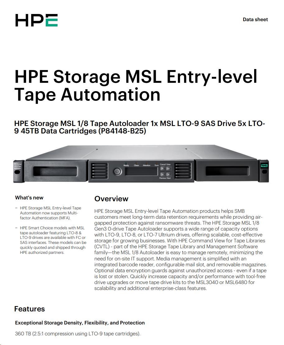 HPE Storage MSL 1/8 Tape Autoloader 1x MSL LTO-9 SAS Drive 5x LTO-9 45TB Data Cartridges