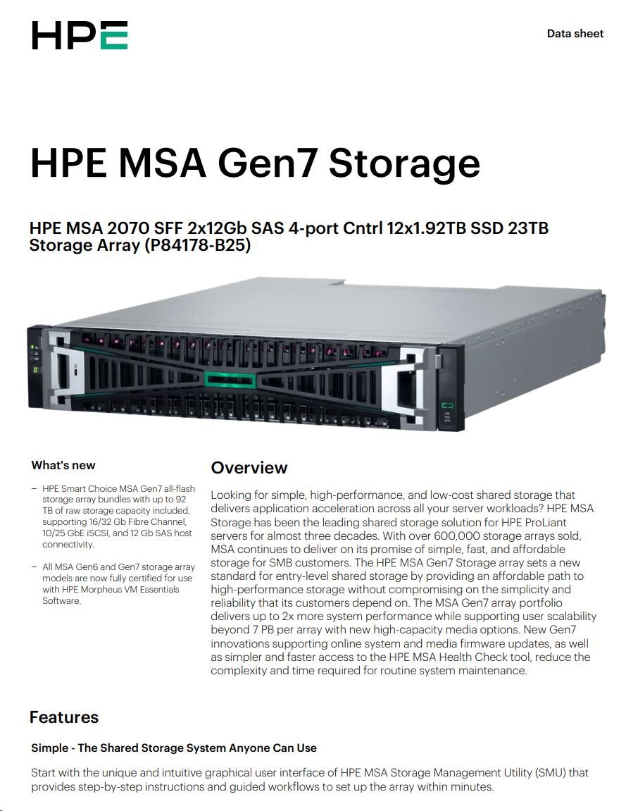 HPE MSA 2070 SFF 2x12Gb SAS 4-port Controller 12x1.92TB SSD 23TB Storage Array Smart Choice