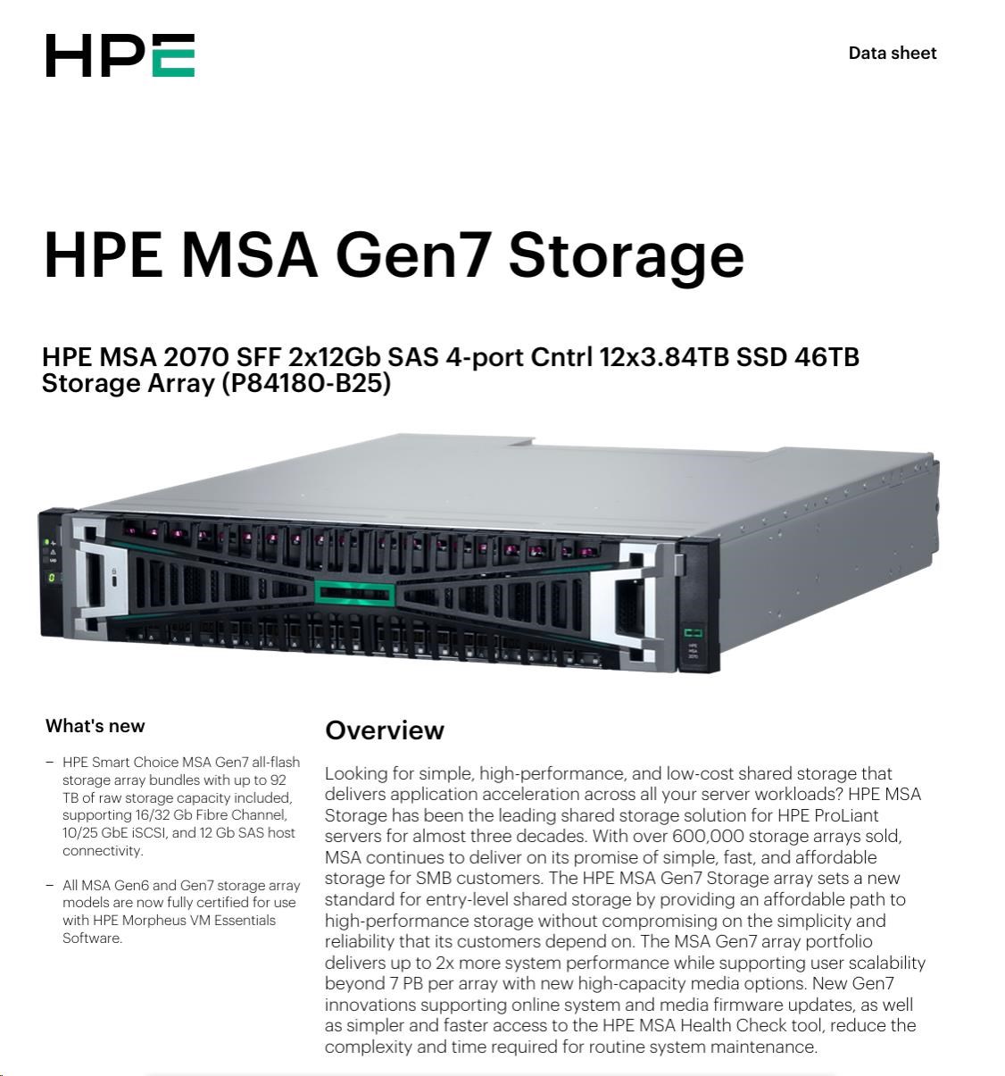 HPE MSA 2070 SFF 2x12Gb SAS 4-port Controller 12x3.84TB SSD 46TB Storage Array Smart Choice