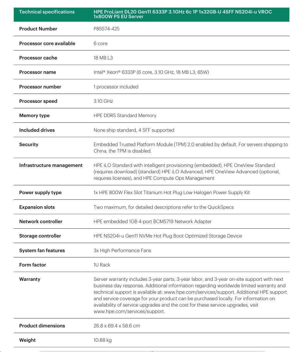 HPE PL DL20 gen11 6333P (3.1G/6C12T) 1x32G (P64339) 4SFF NS204i-u (2x480Gnvme) VROC 1x800W 4x1G NBD333 Smart Choice