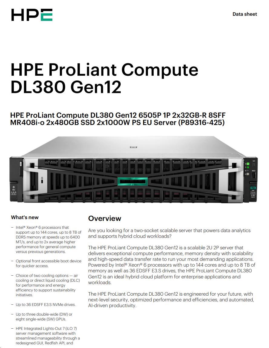 HPE PL DL380g12 6505P (2.2/12C) 2x32G (P69727) 2x8TB MR416i-o 2x1000W 10GbE NBD333 Smart Choice