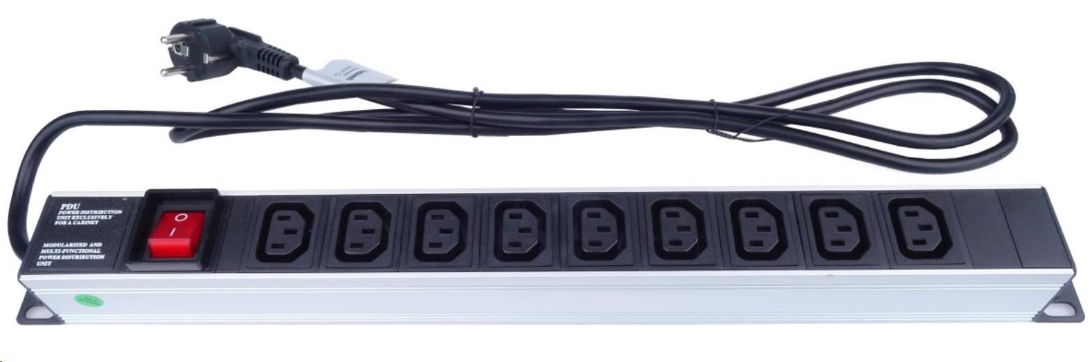 PremiumCord Panel napájecí do 19" racku 1U, 9xIEC (C13), 2m kabel,vypínač - provedení z eloxovaného hliníku - horizontální pro montáž do 19" Racku - výška 1U - 9x IEC (C13) 230V zásuvka - maximální proud: 16A - IEC (C13) zásuvky - 1.5mm2 průřez kabelu - délka kabelu 2m s konektorem do standardní české zásuvky - vypínač prosvětlený s plastovou krytkou proti náhodnému vypnutí - rozměry : šířka s pevnými úchyty: 485mm, výška: 40mm, hloubka: 44mm - pracovní teplota: 0-40°C - napájecí panel obsahuje sáček s kompletní sadou šroubů pro instalaci do 19' racku