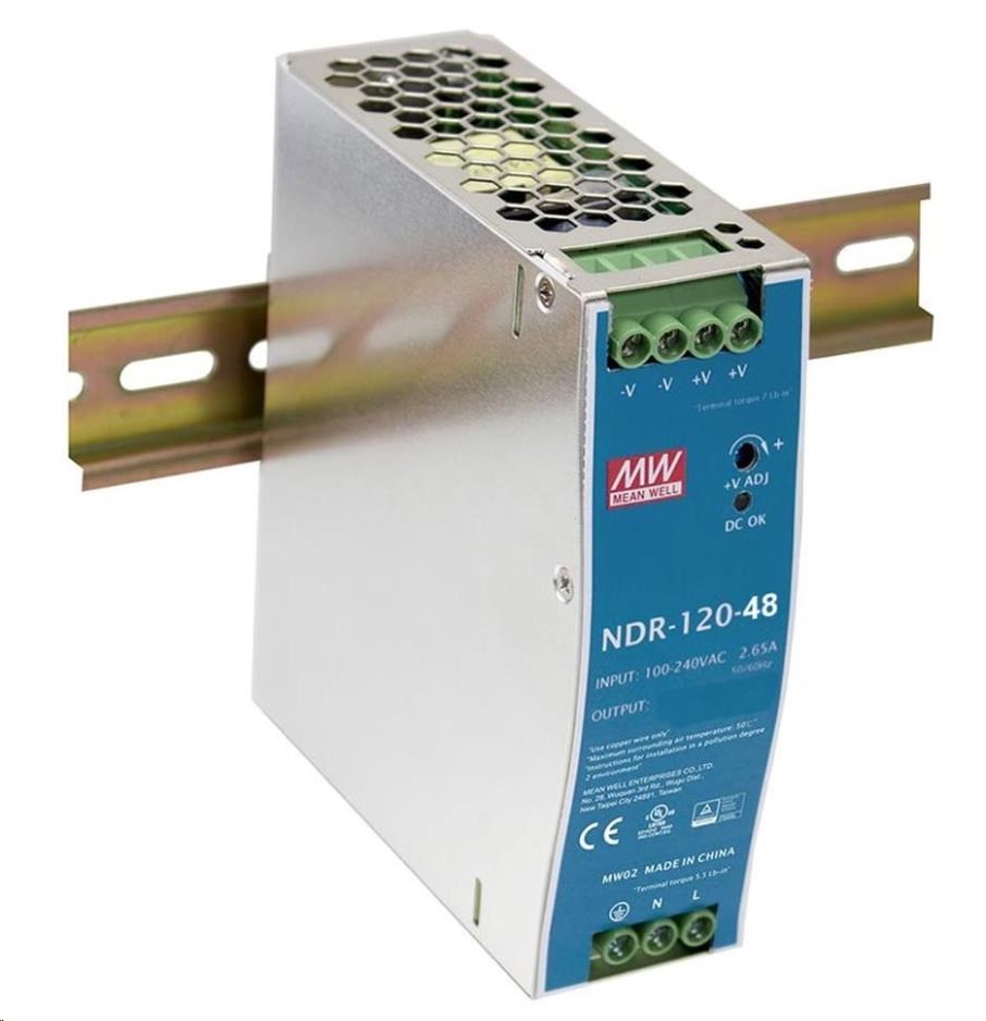 Napájecí zdroj pro instalaci na DIN lištu. Výstupní napětí 48V DC, zatížitelnost 120W. Provozní teplota -10 až 60°C. ZÁKLADNÍ SPECIFIKACE Výstupní napětí: 48-56V DC Výstupní výkon: 120 W Vstupní napětí: 100 - 240V AC Certifikace: CE EN-60950-1 Rozměry: 65 x 100 x 125 mm Hmotnost: 0,79 kg