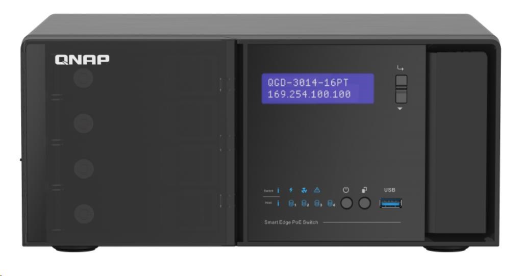 Řízený stolní switch QGD-3014-16PT Guardian PoE má šestnáct 30W gigabitových portů PoE, dva kombinované porty Gigabit SFP/RJ45 a dva hostitelské porty 2,5GbE. Díky konstrukci se dvěma procesory, včetně čtyřjádrového procesoru Intel Celeron J4125 s frekvencí 1,8 GHz, a čtyřmi 3,5" diskovými pozicemi SATA splňuje zařízení QGD-3014-16PT požadavky pro vysokorychlostní přenos, úložný prostor a výkon virtuálního počítače v dozorovacích aplikacích. Zařízení QGD-3014-16PT, které podporuje virtuální počítače a QTS pro všestranné aplikace, jako jsou QVR Pro, HBS 3 a QuWAN, kombinuje zavedení dozorování, výpočetní výkon pro ukládání videí, vzdálené zálohování a optimalizaci WAN a vytváří inteligentní infrastrukturu pro dozorování a řešení vzdáleného zálohování.