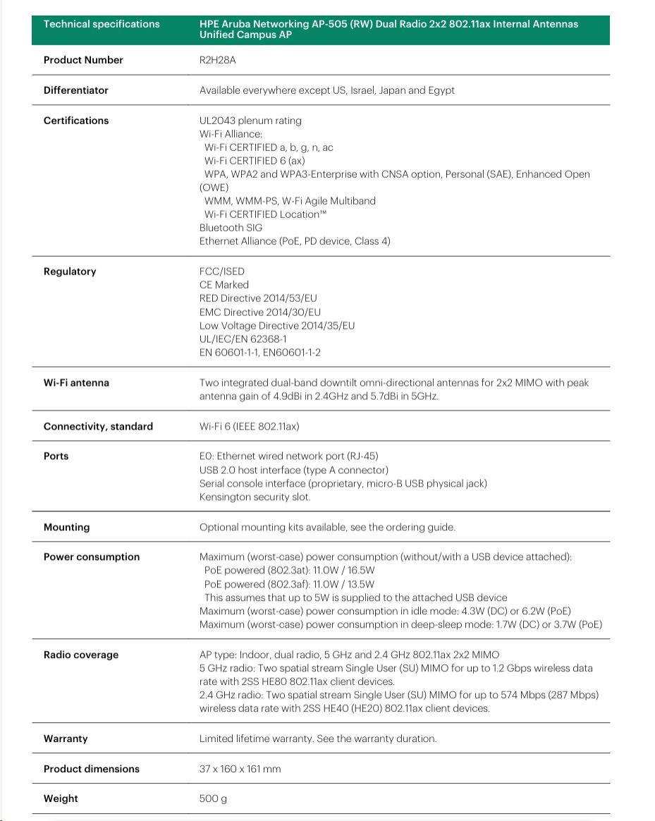 Aruba AP-505 (RW) Dual Radio 2x2:2 802.11ax Internal Antennas Unified Campus AP