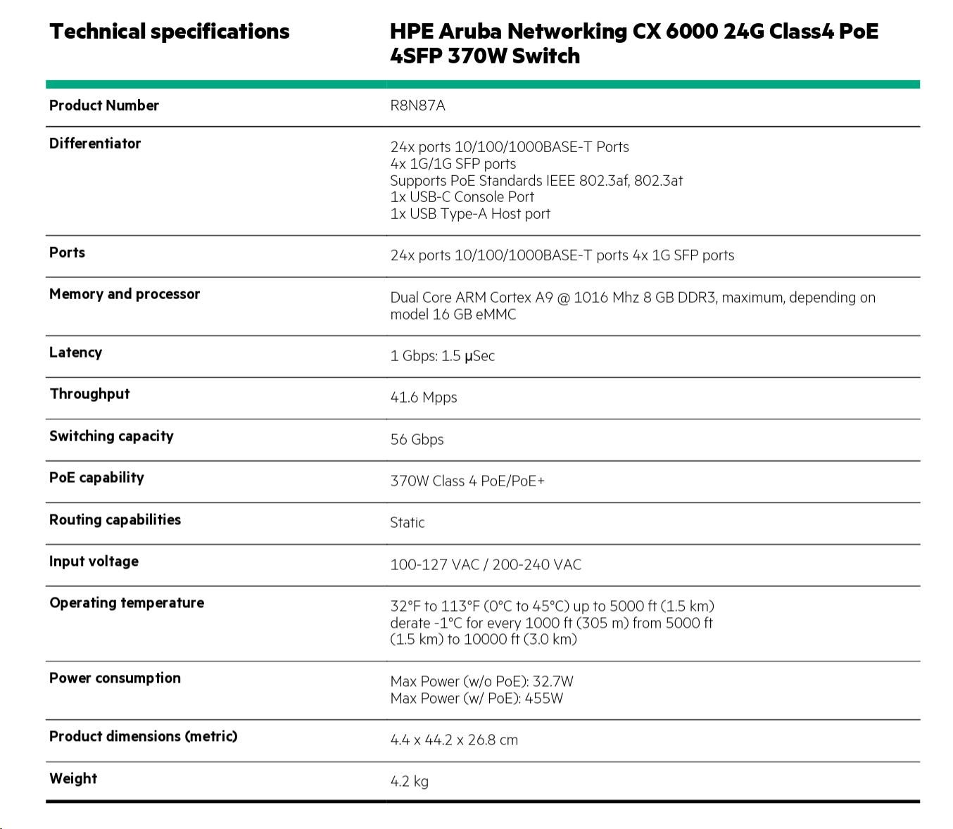 HPE Aruba Networking CX 6000 24G Class4 PoE 4SFP 370W Switch