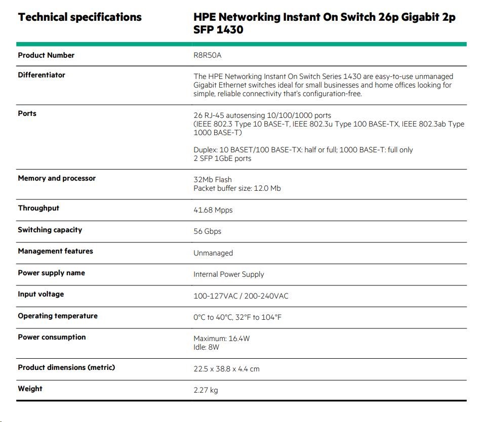 R8R50A HPE Networking Instant On Switch 26p Gigabit 2p SFP 1430