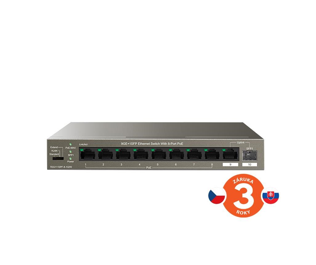 Tenda TEF1110P-8-102W přepíná data pomocí 10ti portů RJ45, 8 portů 10/100 Mb/s podporuje PoE802.3af/at + 2 porty 10/100/1000 Mb/s pro Uplink. Switch má ochranu proti přepětí 6kV. Podpora přepojování uzlů v módu Store-and-Forward. Full-duplex kontrola toku 802.3x, half-duplex kontrola toku v režimu Back-Pressure. TEF1110P-8-102W je vhodná jak do menších a středních firem, tak i do domácností.