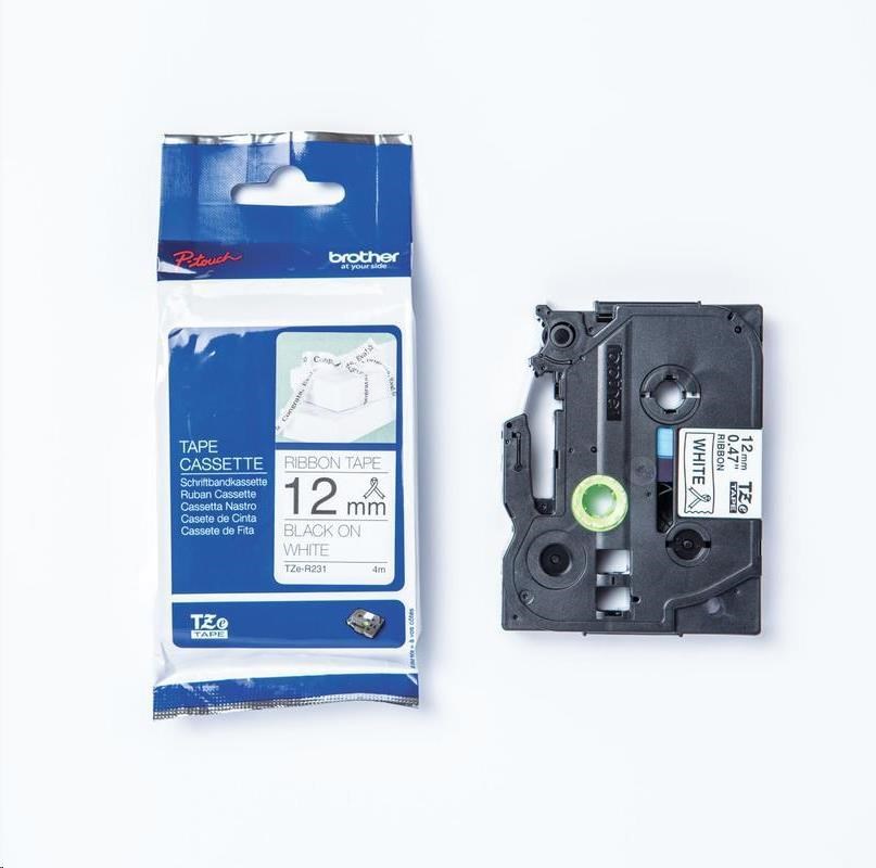 BROTHER TZE-R231 - kazeta TZ šířky 12mm, TEXTILNÍ páska 4m- pro tvorbu dárků - NELEPÍCÍ - BÍLÁ PÁSKA, ČERNÝ POTISK