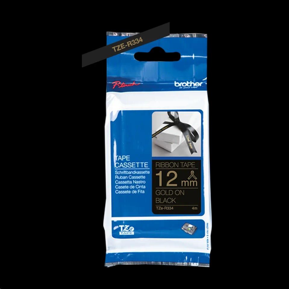 BROTHER TZE-R334 - kazeta TZ šířky 12mm, TEXTILNÍ páska 4m- pro tvorbu dárků - NELEPÍCÍ - ČERNÁ PÁSKA, ZLATÝ POTISK gold