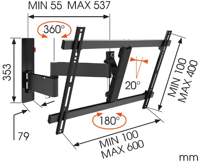 W 53080 WALL Polohovatelné rameno pro velká LCD (3 klouby) W53080 se vyznačuje stylovým ramenem, které nabízí snadnou manipulaci. Obrazovku je možno odklopit od stěny, natáčet do stran a sklápět až o 20° dolů. Díky delšímu ramenu lze TV natočit kolmo ke stěně, popř. odtáhnout po kolmici od stěny. další vlastnosti: *hloubka pouhých 5,5 cm *stylový vzhled - rameno z hliníkové slitiny s perfektní povrchovou úpravou, extra štíhlé uchycení na zdi s krytem ve vysokém lesku *lehký pohyb s ramenem, snadné nastavení náklonu s magnetickou aretací svislé polohy *úchyty pro vedení kabelů pod ramenem *3 klouby *jednoduchá montáž na 3 šrouby *univerzální uchycení až do 600x400 Specifikace výrobku: *nosnost 30 kg *uchycení max. 600x400 *úhlopříčka cm 102 -165 *úhlopříčka palce 40 - 65 '' *náklon 20° *natáčení 180° *materiál kov *barva černá